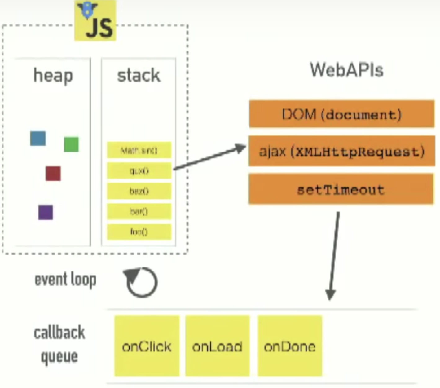 - 오래걸리는 작업은 백그라운드에서 진행하며 완료 후, 이벤트 루프를 통해 태스크 큐를 거쳐 호출스택에 올라오길 기다리는 방식